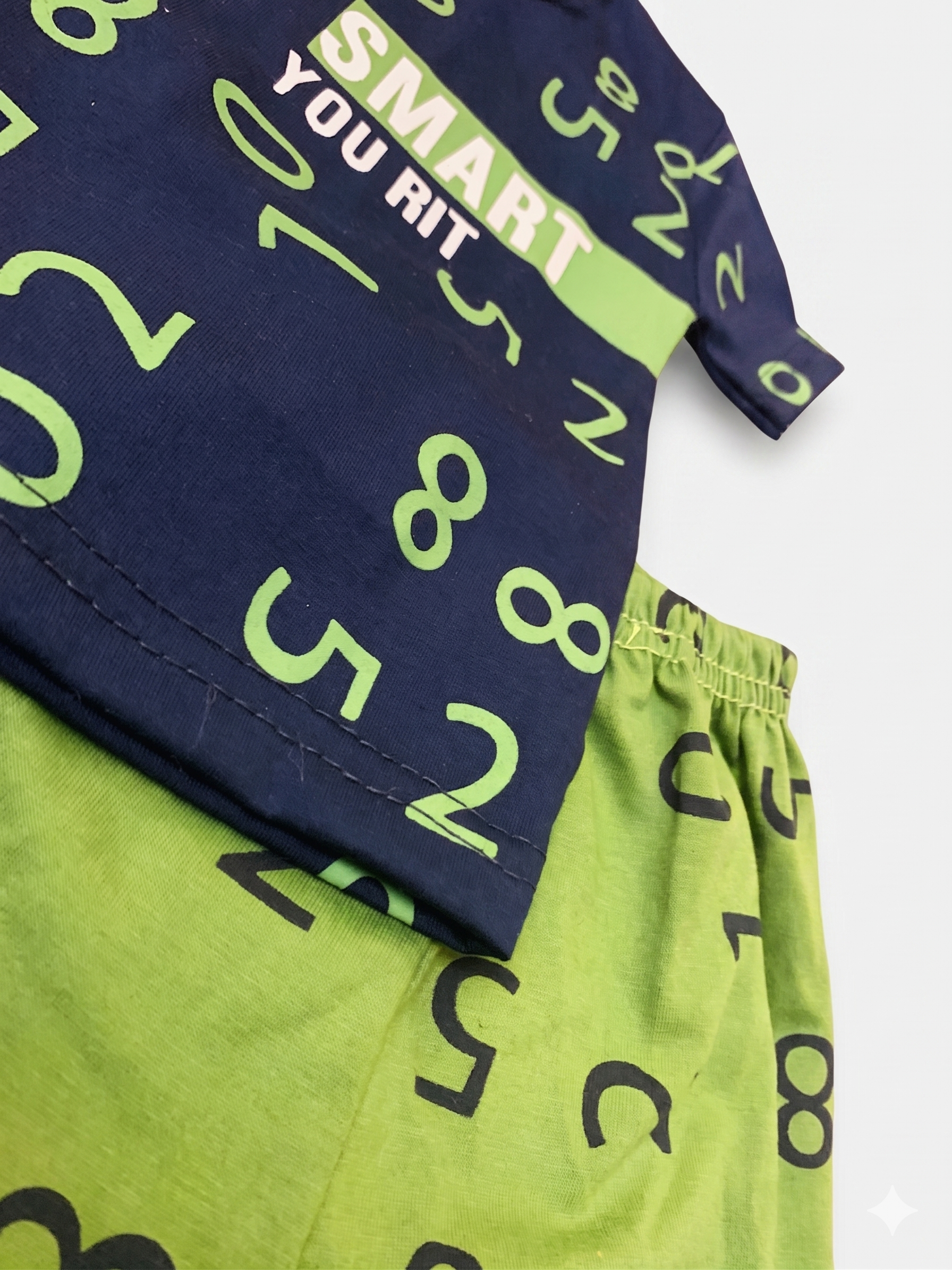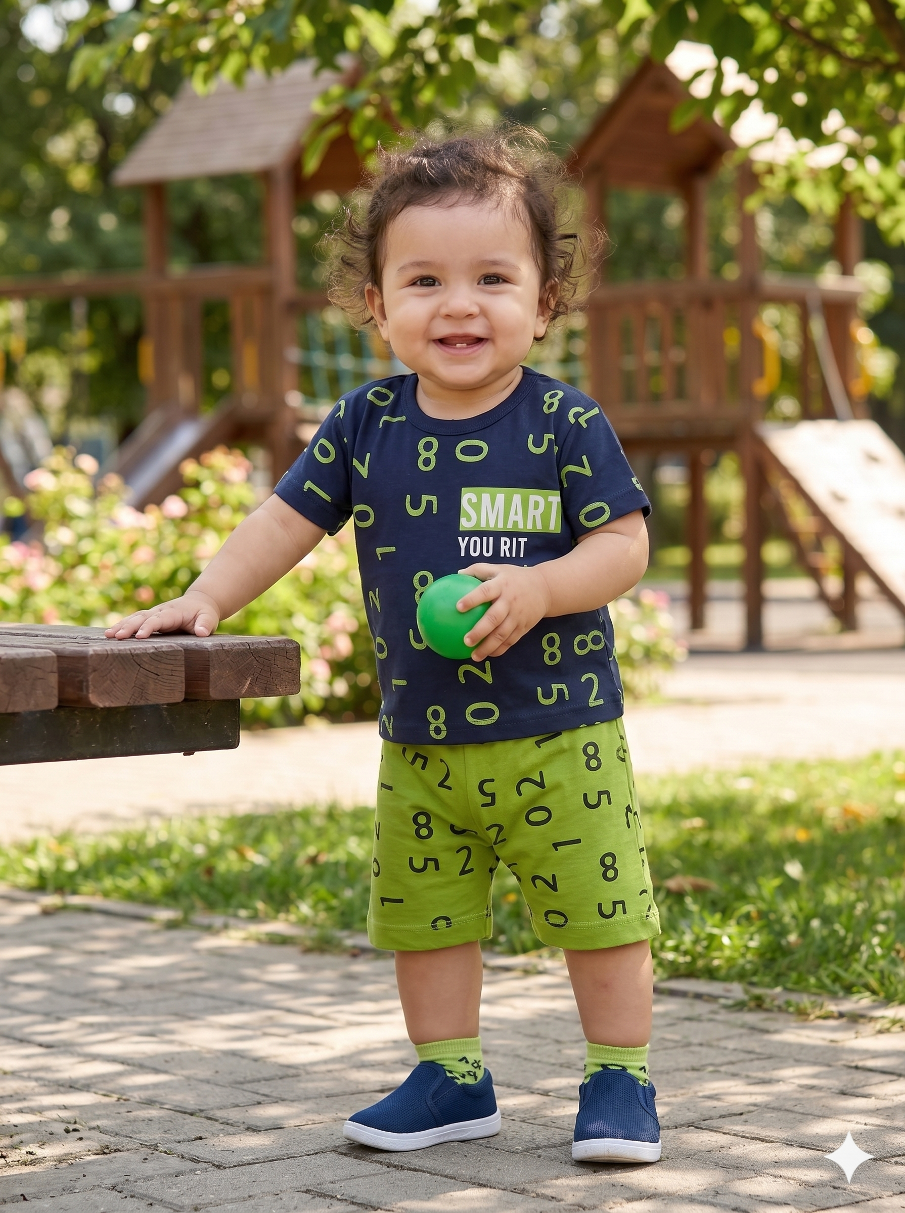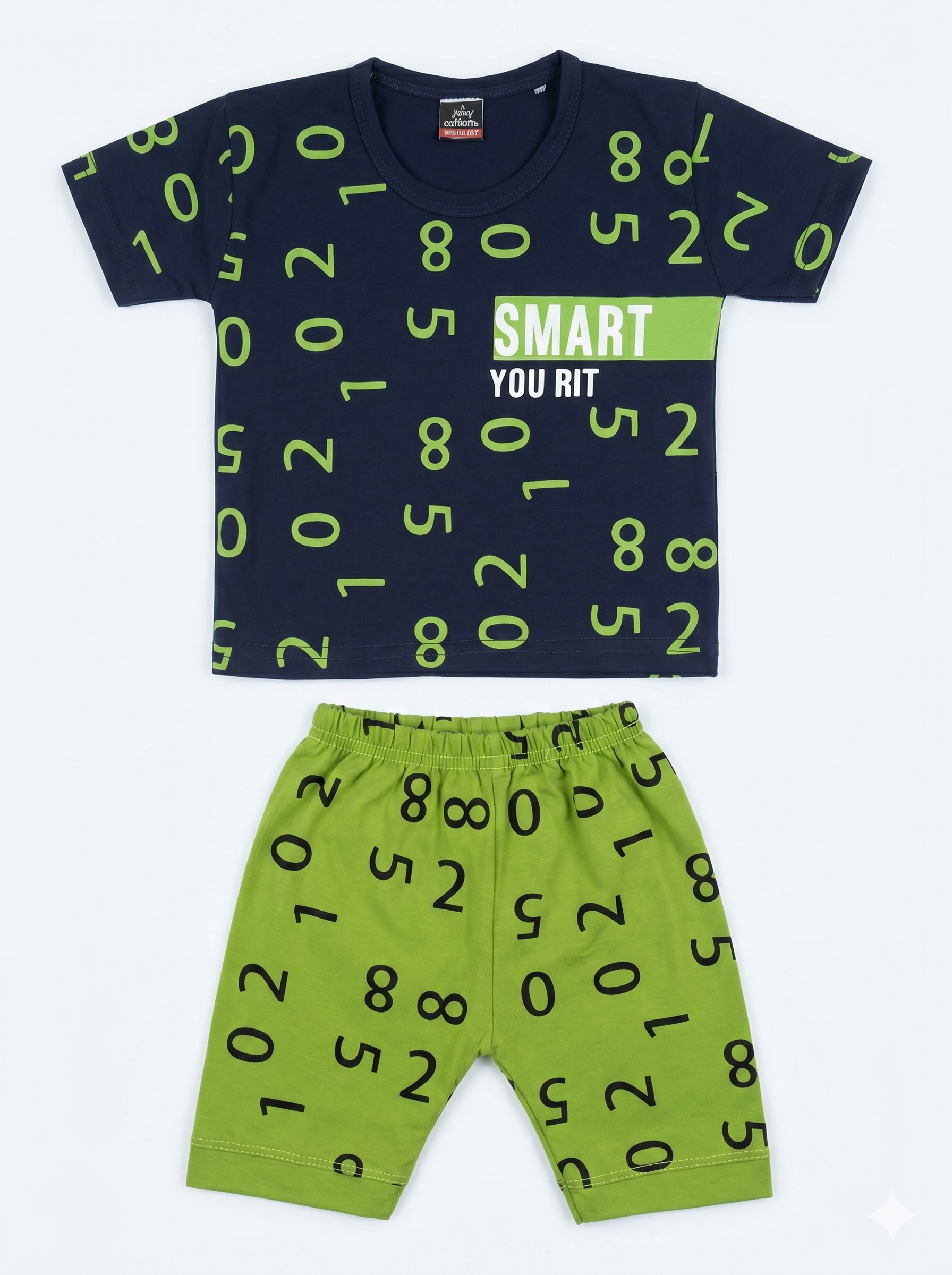 Trendy and comfortable baby boys’ summer outfit featuring a navy blue t-shirt with stylish number print and matching green shorts. Made from soft, breathable fabric to keep your little one cool and active all day. Perfect for casual wear, outings, and playtime.